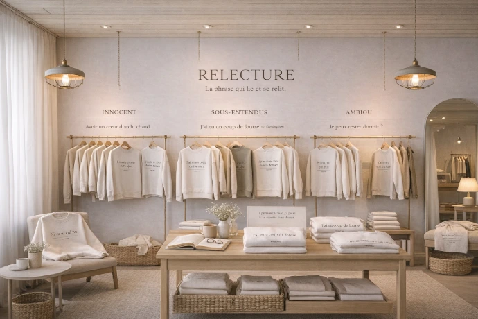 Une humeur. Une pensée. Une petite provocation douce. Des couleurs neutres, des coupes simples, et des phrases qui font sourire, réagir ou réfléchir.
