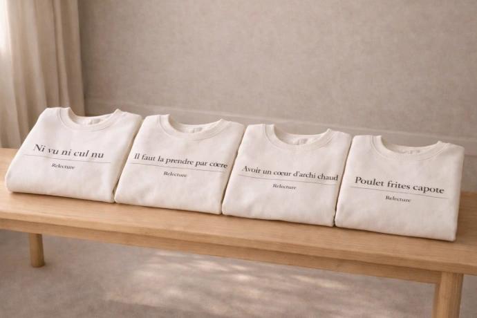 Chez Relecture, les mots du quotidien prennent un léger détour. Chaque pièce joue avec les expressions, les sons et les doubles sens pour créer une lecture immédiate… puis une relecture plus personnelle.